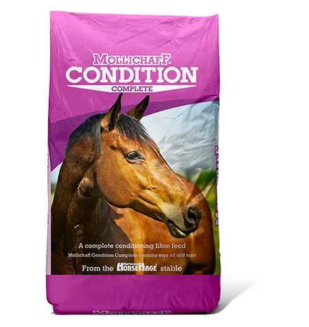 Mollichaff Condition is a nutritionally balanced feed ideal for all horses and ponies, especially those which require extra weight gain. It contains a blend of alfalfa, dried grass, oat straw, fibre pellets, flaked barley, soya oil, soya flakes and mint, along with vitamins, minerals, trace elements, Yea-sacc and a prebiotic for a complete feed. The addition of mint is included to aid digestion, as well as being appealing to horses. Mollichaff Condition can be fed as the sole concentrate feed, and only good quality forage needs to be fed in addition.